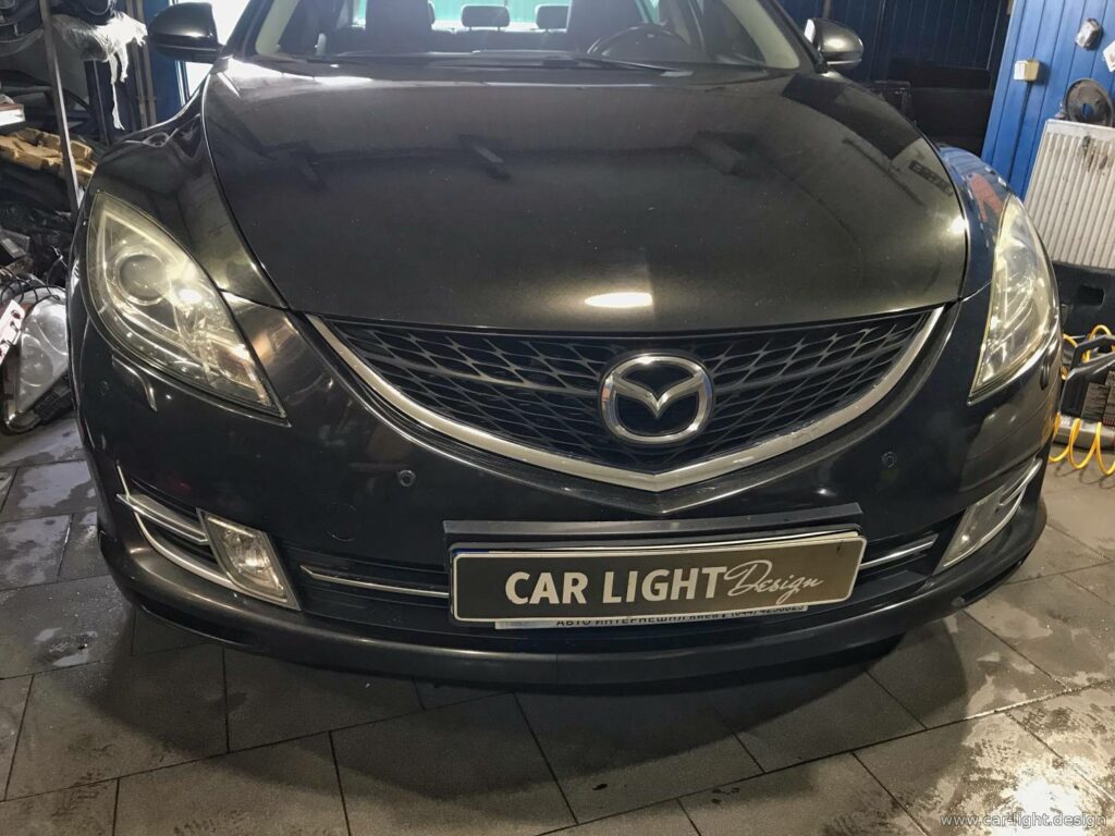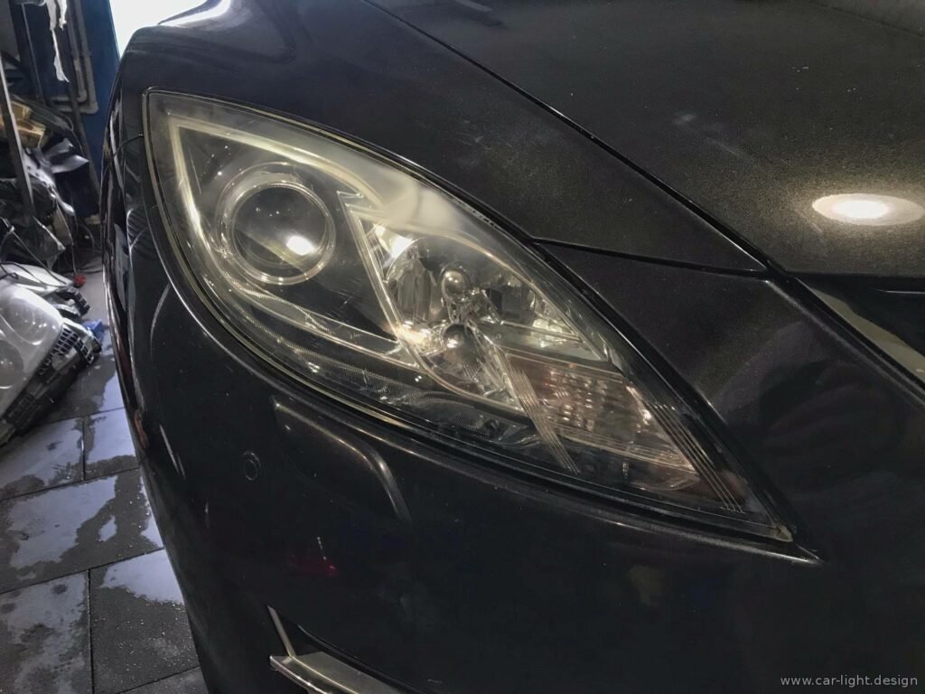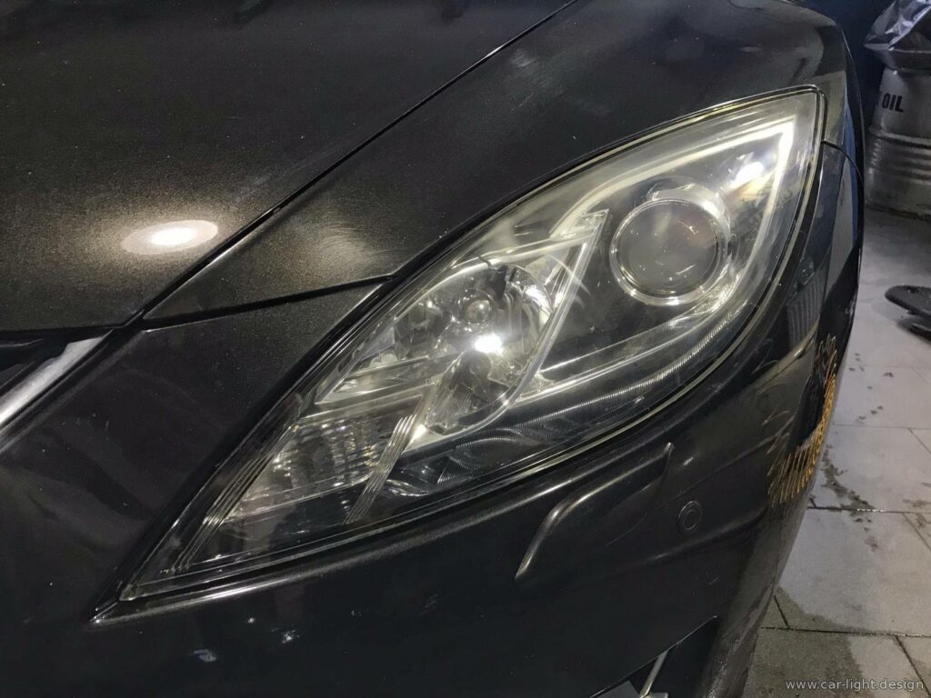 A Mazda 6 arrived at our car light service in Kyiv, which would benefit from a complete preventive maintenance of its optics. The optimal solution in this case would be to open the headlights, perform preventive cleaning of the factory xenon lenses, and polish the inside and outside of the headlight glass.