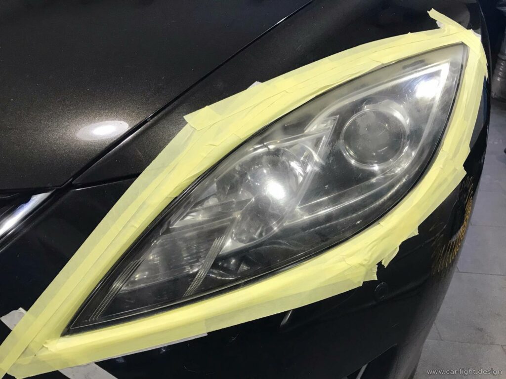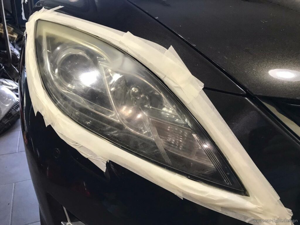 Before starting work, the service specialists prepared the optics for a cycle of polishing procedures. The headlight glass was cleaned and prepared for step-by-step processing from the outside.