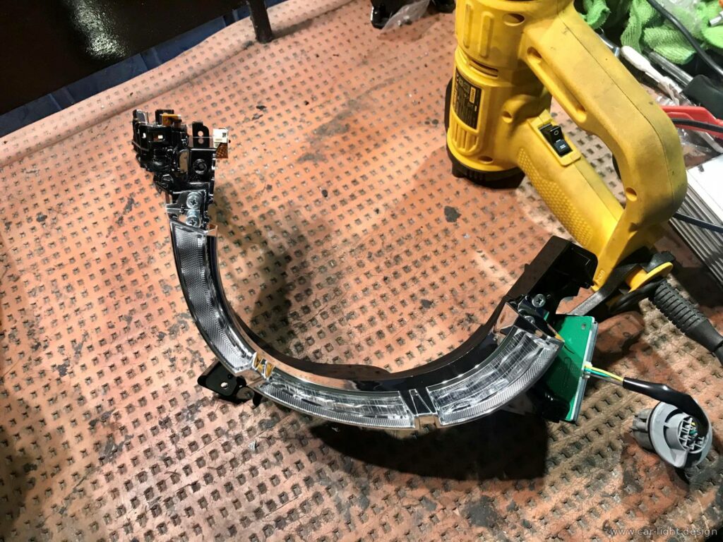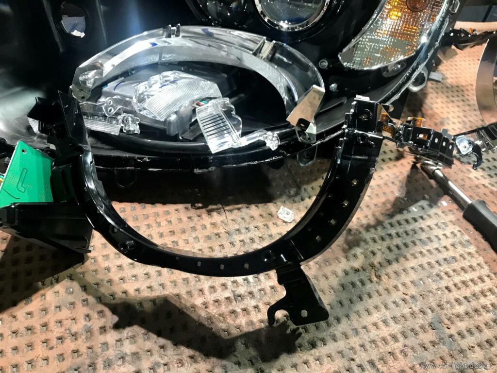 To repair the LEDs, the headlight was removed from the car and opened along the factory seam. After separating the glass from the body, it was possible to access the LED module and perform a detailed diagnosis.