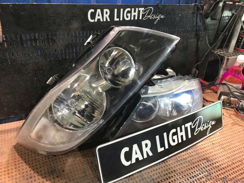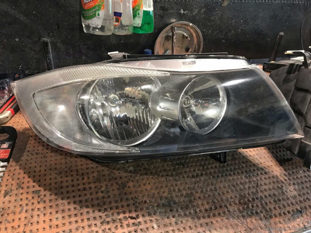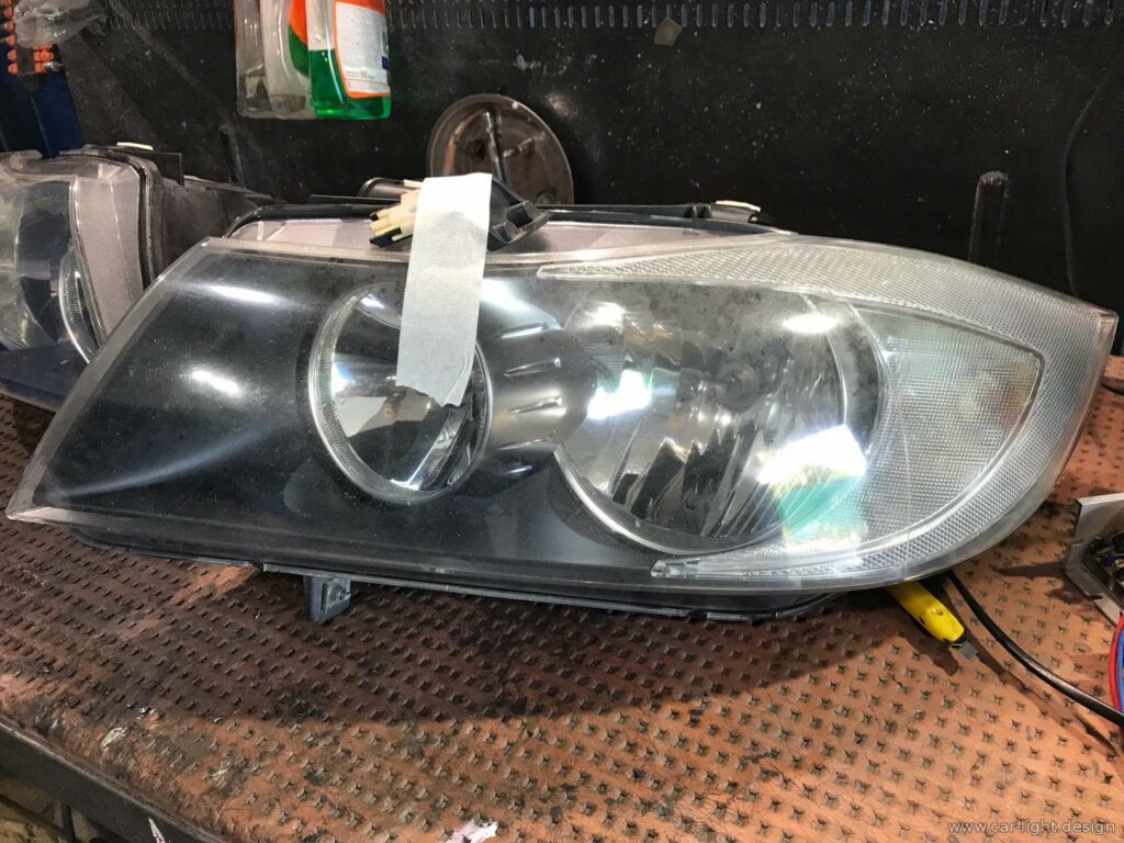 Our car lighting service in Kyiv received two headlights from a BMW e90, which had noticeable internal contamination. Fine dust and deposits had accumulated inside the optics, and a slight cloudiness had appeared on the glass of both headlights.