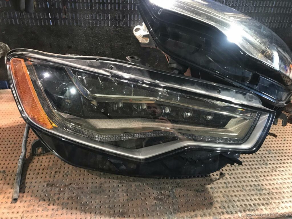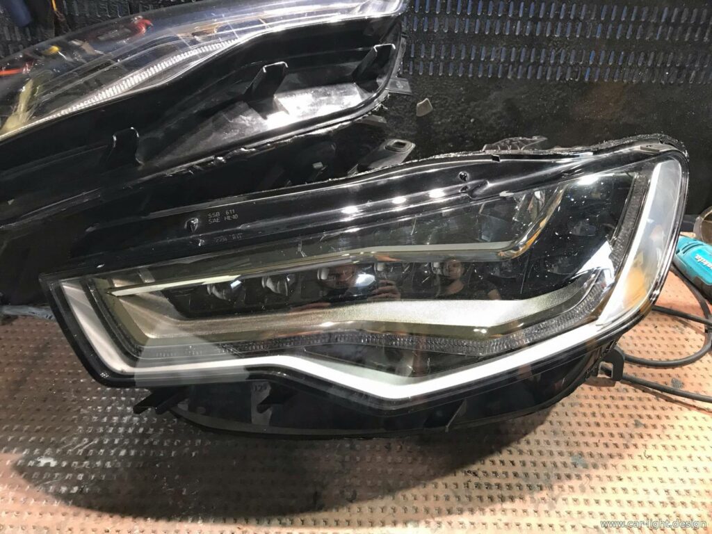 Чтобы убрать этот визуальный акцент и сделать фары более сдержанными, владелец обратился в наш сервис автосвета для покраски фар Audi A6 c7.