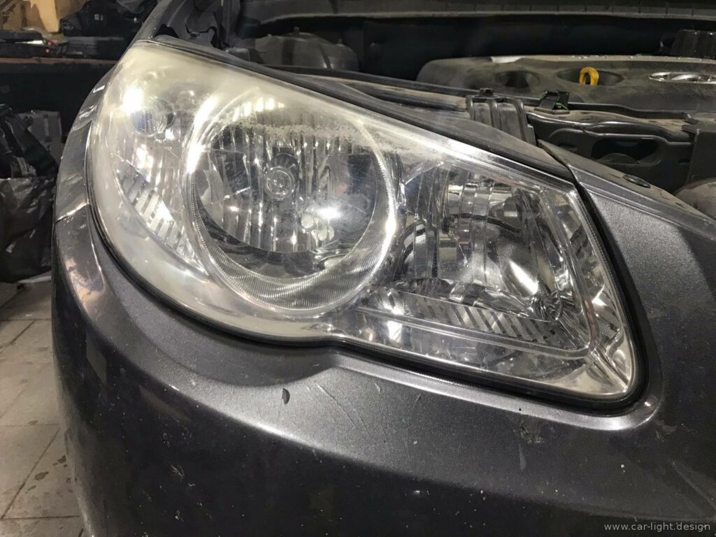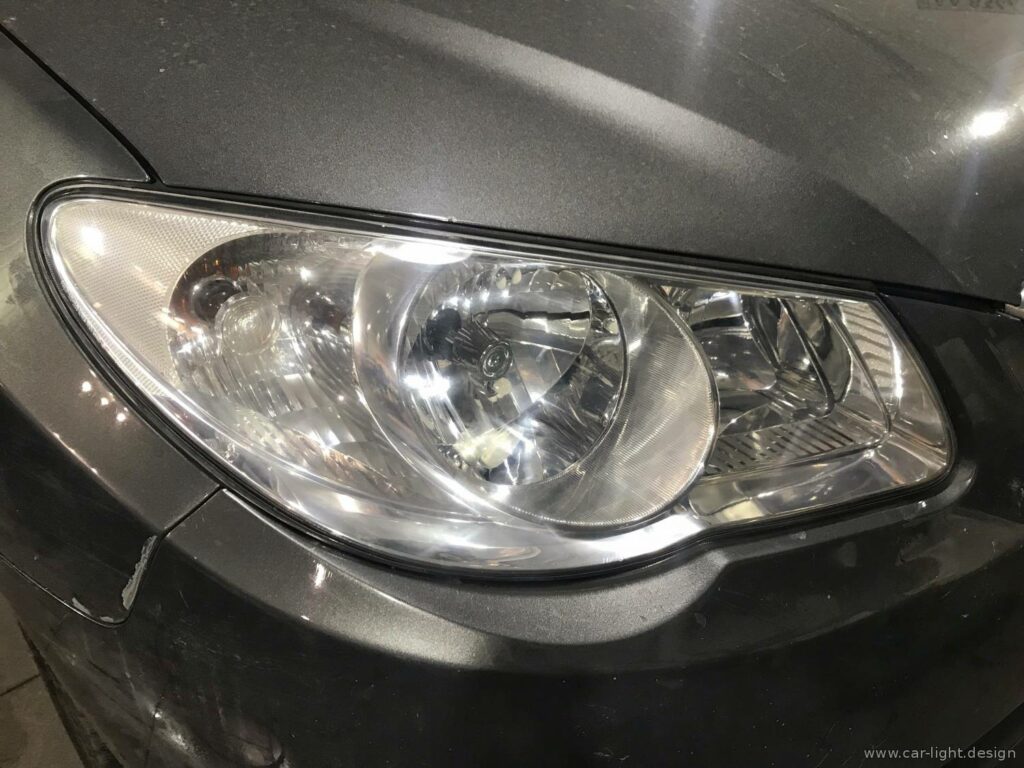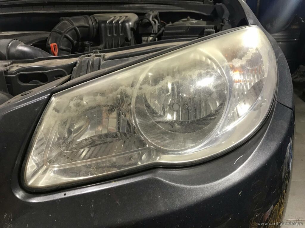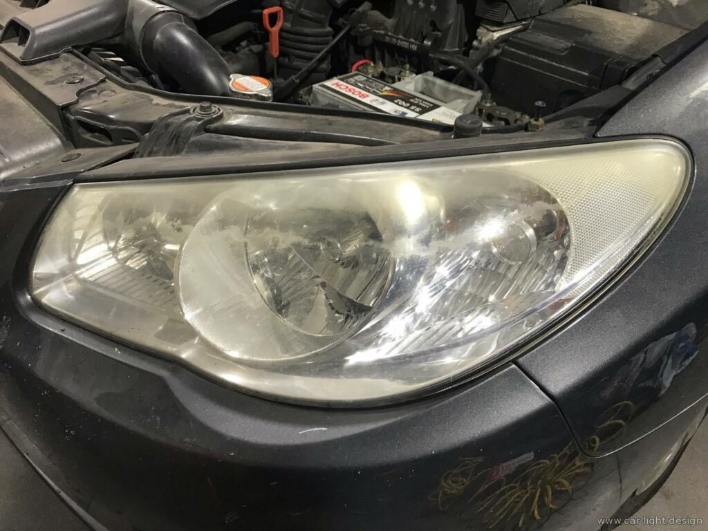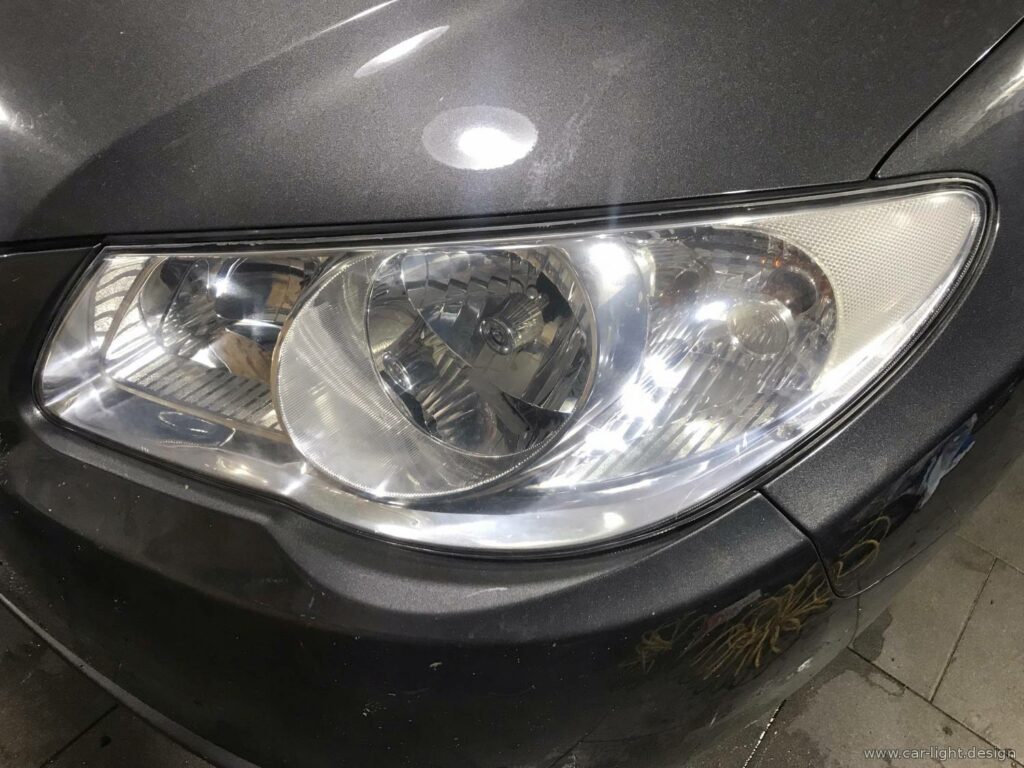 С учетом ограниченного бюджета на восстановление эстетики фар было принято рациональное решение — выполнить шлифовку и полировку внешней стороны стекла фар. Это позволило существенно улучшить внешний вид и частично восстановить светопропускающую способность оптики.