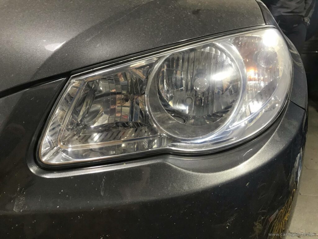 В наш сервис автосвета в Киеве заехал Hyundai Accent, у которого уже были заметны проблемы с эстетикой стекла фар. Желтизна стала хорошо видна, а заводское покрытие местами потеряло свою целостность.