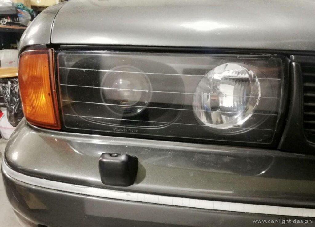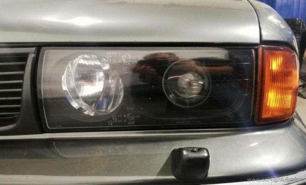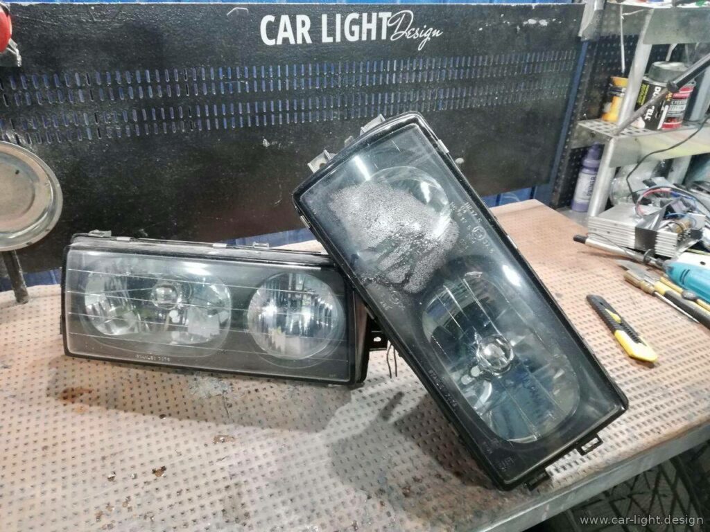 Фары были демонтированы с автомобиля. Стекло отделили от корпуса, после чего извлекли отражатели. Зоны отражателей, в которых планировалась установка биксеноновых линз, подготовили к окраске в черный матовый цвет. Также к окраске были подготовлены маски биксеноновых линз.