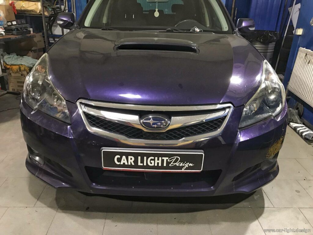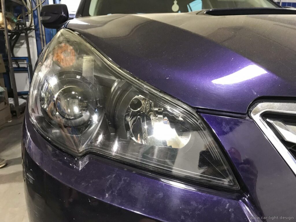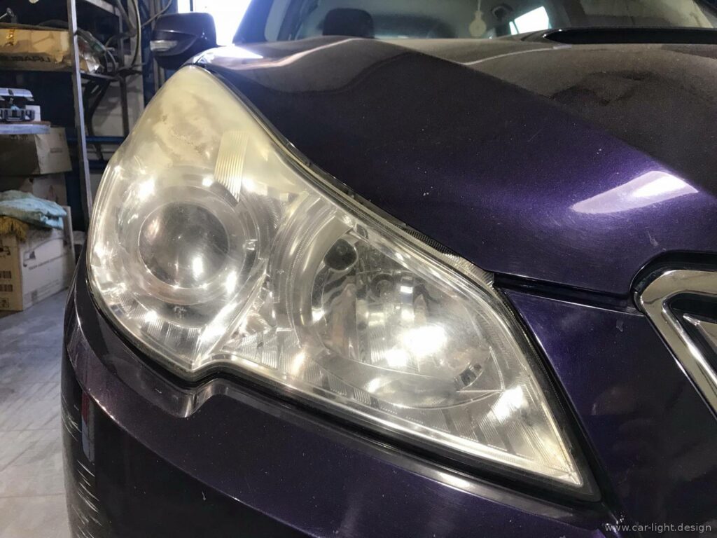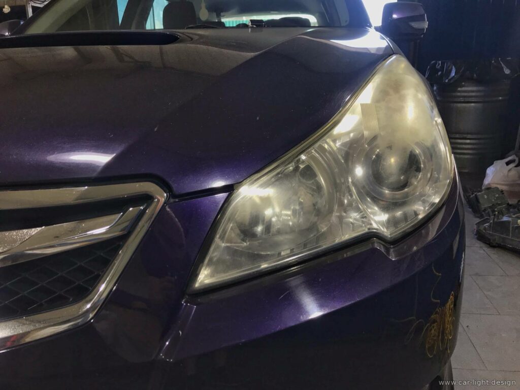 В наш сервис автосвета обратился владелец Subaru Legacy с запросом на восстановление света и возвращение нормальной видимости в ночное время. Оптика автомобиля с завода была с галогенными линзами, поэтому для понимания текущего состояния специалисты выполнили проекцию света на экран-полотно и оценили общий ресурс модулей.