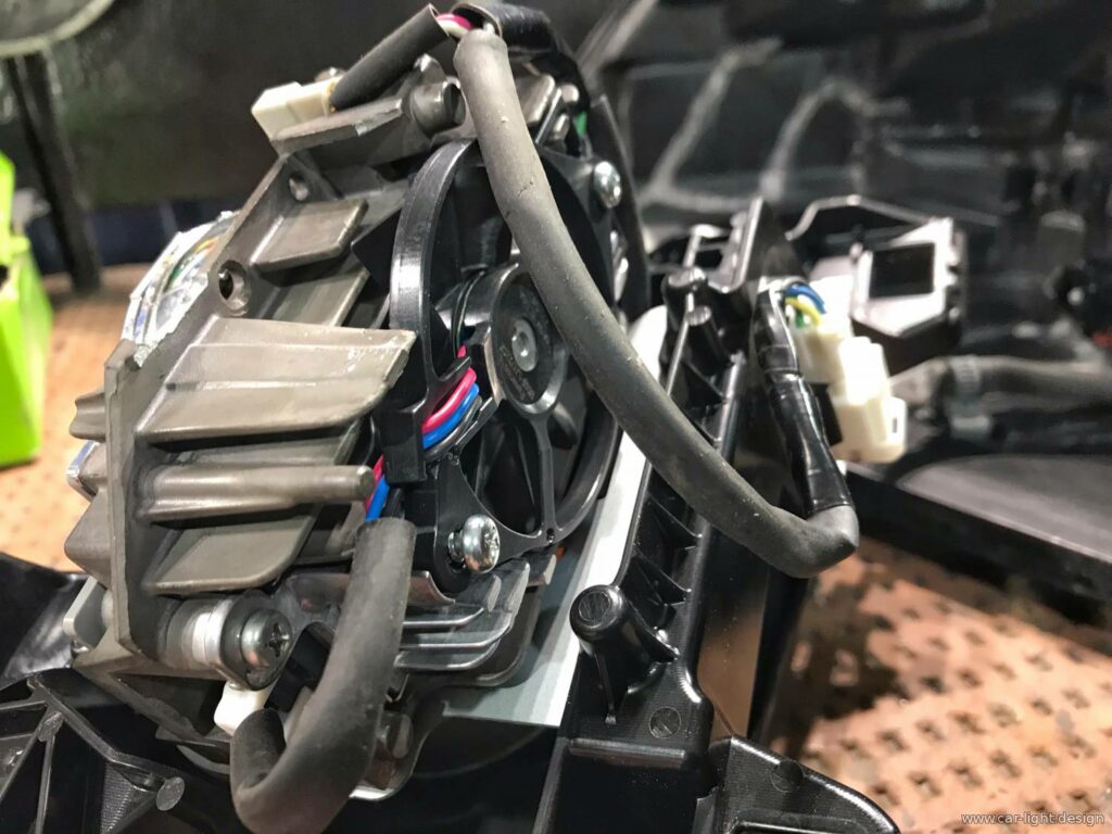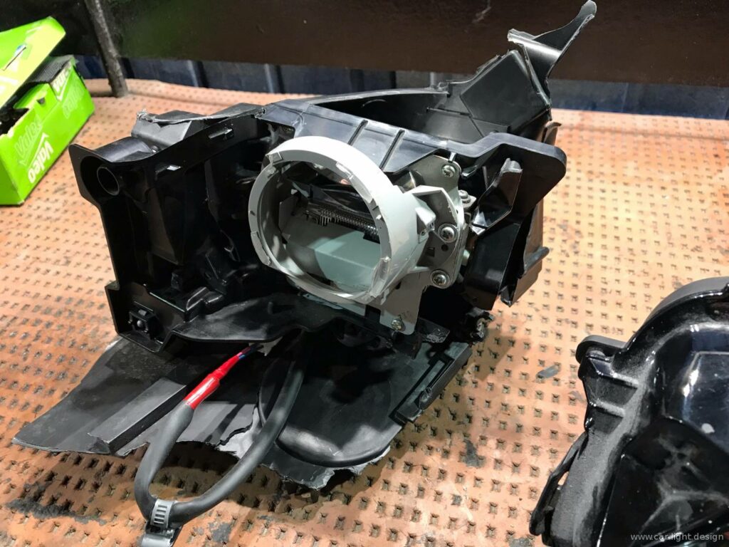 Фахівці нашого сервісу акуратно розібрали фару з розборки. Після діагностики стало зрозуміло, які елементи модуля потребують заміни. У результаті ми перенесли справні компоненти з рідної фари та інтегрували їх у донорську оптику.