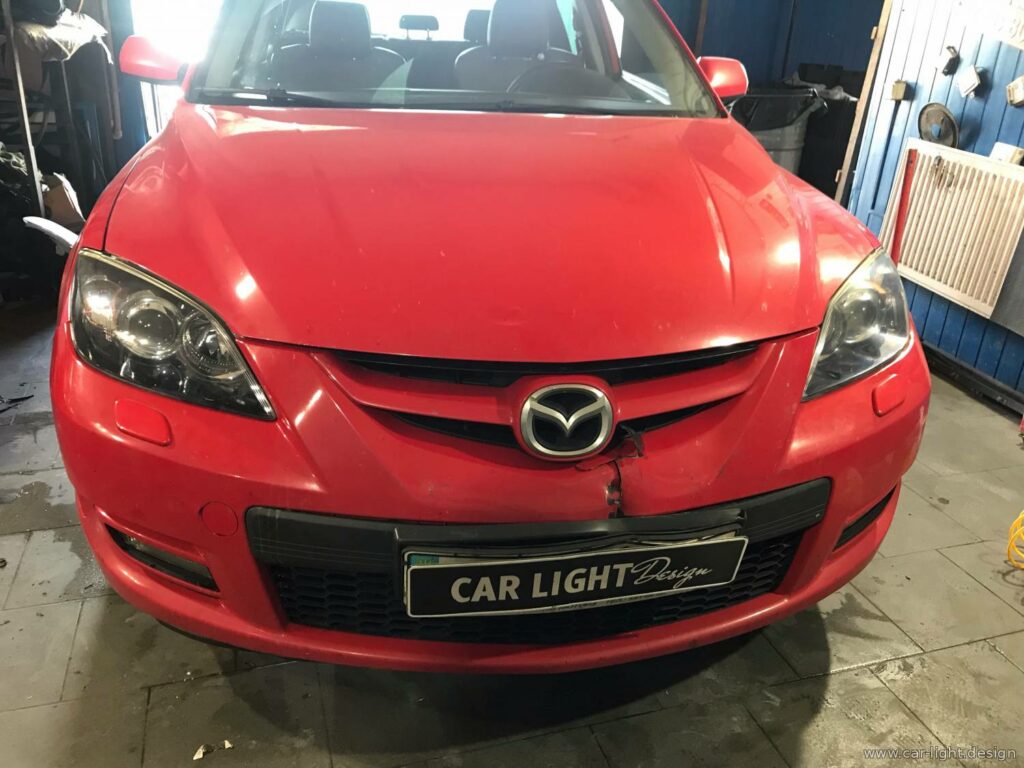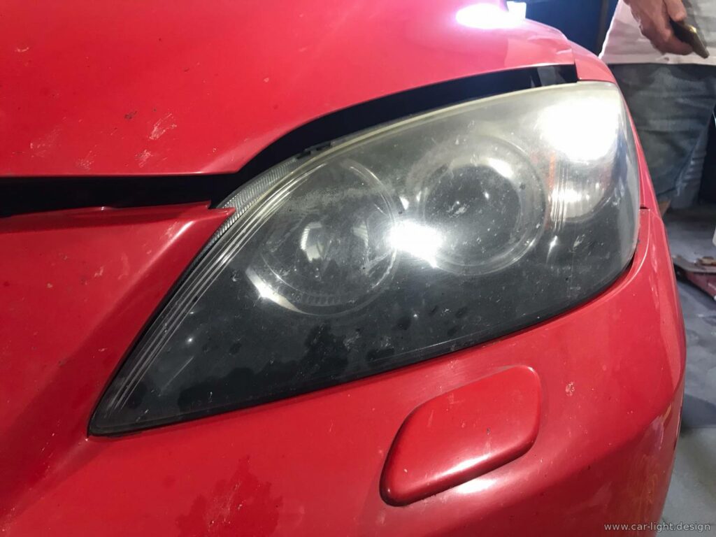 До нашого сервісу автосвітла у Києві приїхала Mazda 6 MPS з оптикою, у якої почалися проблеми з пластиковими стеклами. Заводське захисне покриття місцями злізло та потріскалося внаслідок часу й умов експлуатації. Це відкрило доступ до агресивного зовнішнього впливу — ультрафіолетового випромінювання та активних хімічних речовин, що з часом неминуче призводить до помутніння скла та втрати ефективності світла фар.