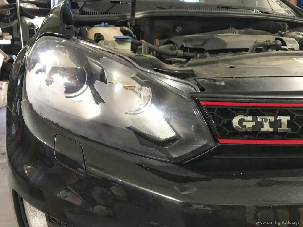 До нашого сервісу автосвітла у Києві заїхав Volkswagen Golf GTI з проблемою пошкодженого захисного шару на одному зі стекол фар. Лак почав відшаровуватися, що одразу вплинуло на зовнішній вигляд оптики та якість світла.