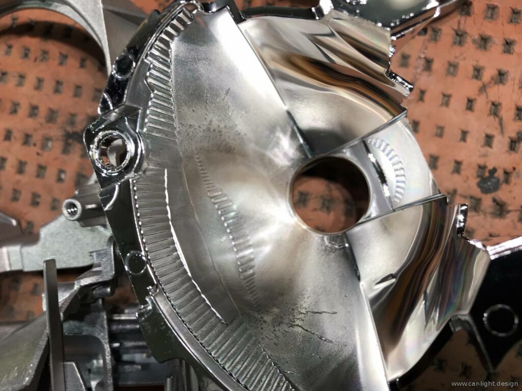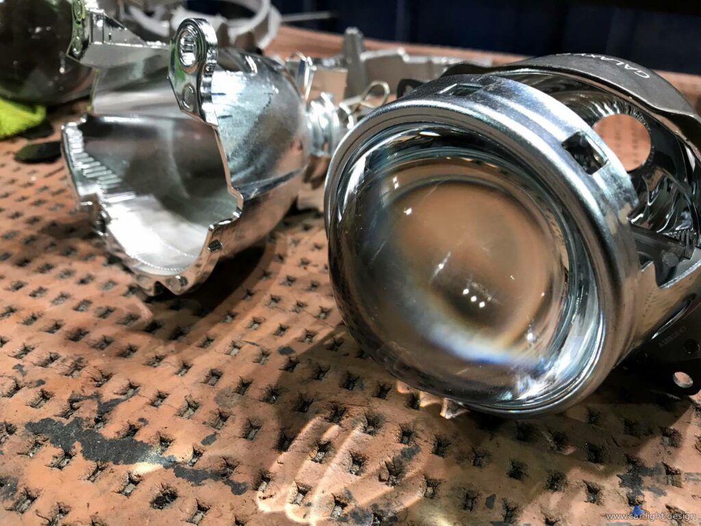 Ми прийняли рішення замінити застарілі лінзи на нові бі-лінзи 3.0 дюйма. Внутрішні елементи, які підлягали збереженню, були ретельно очищені, а тріщина на склі — герметизована. Після збирання оптики провели контрольну перевірку на герметичність, щоб упевнитися у відсутності повторного запотівання.