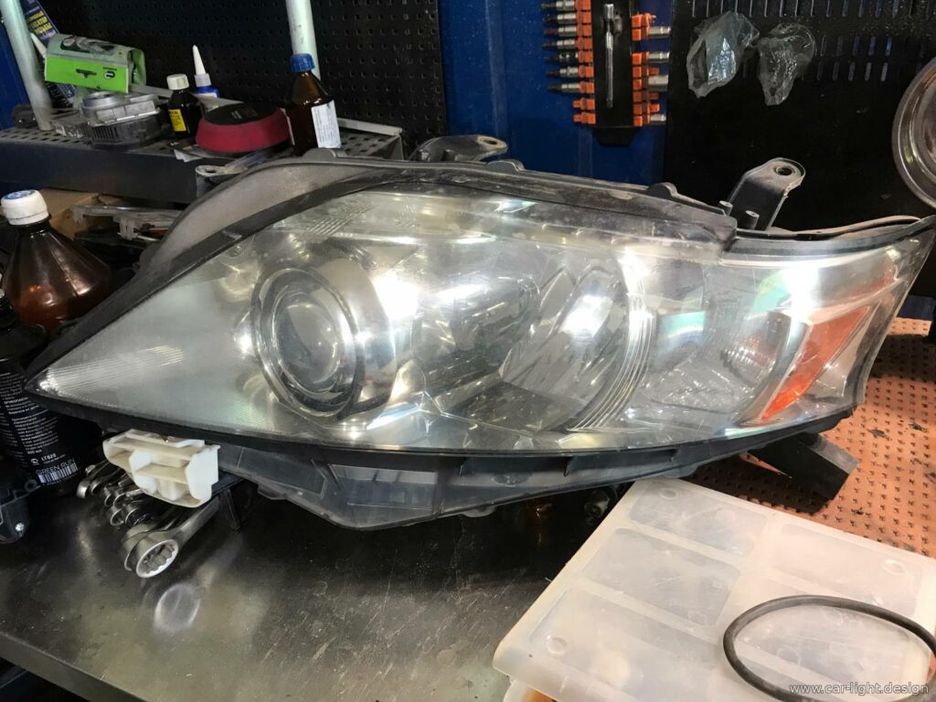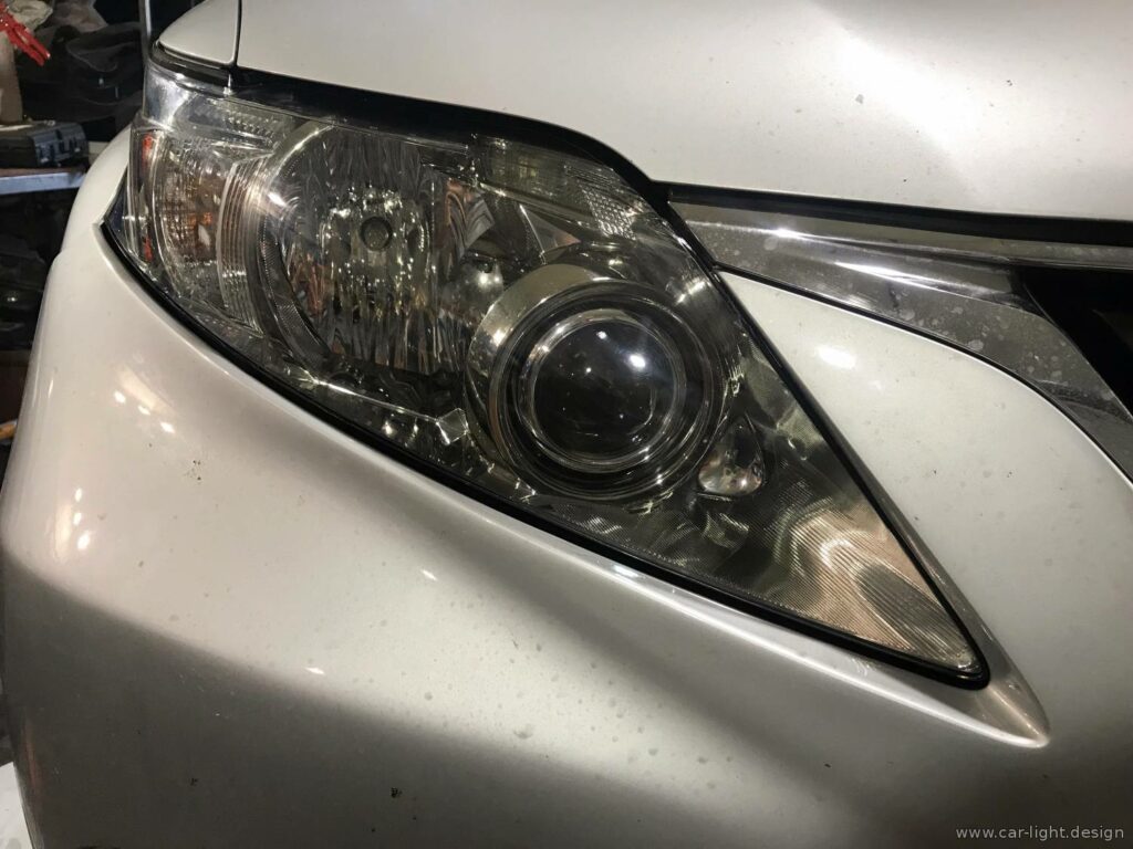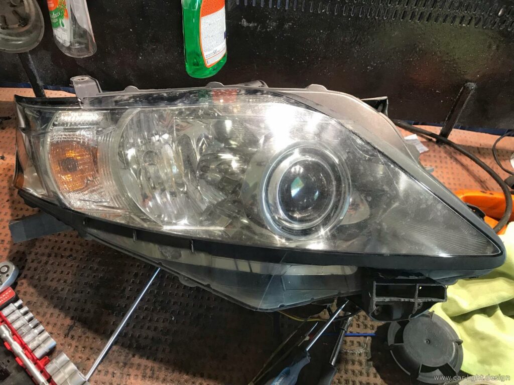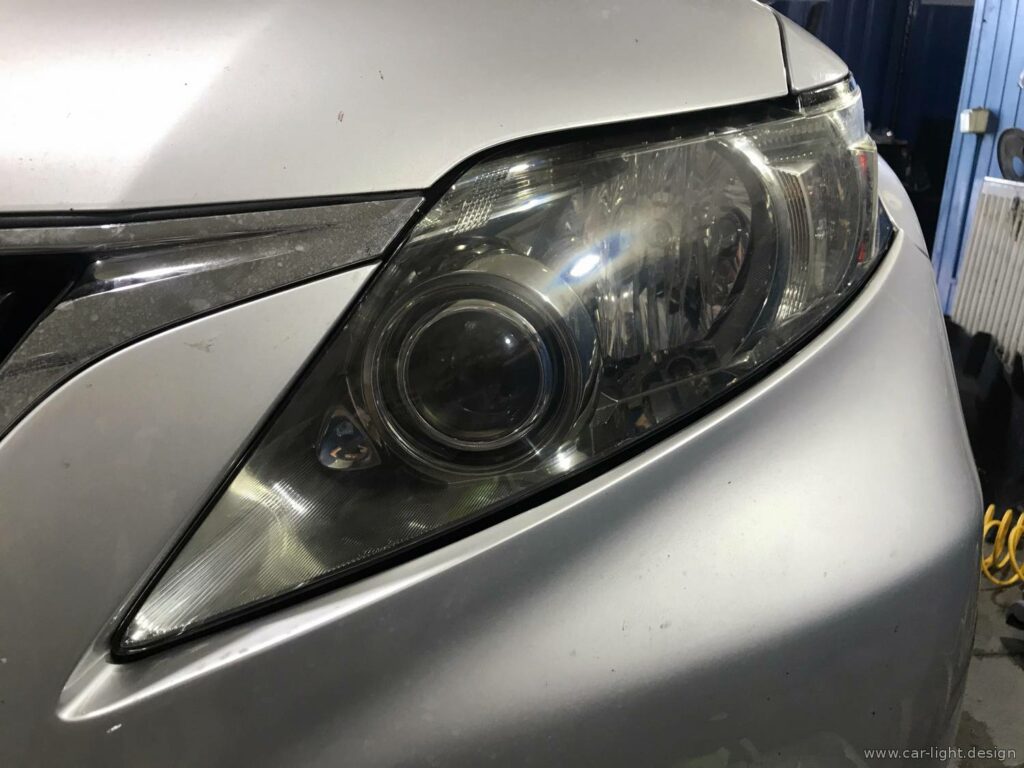 До нашого сервісу автосвітла приїхав Lexus RX 430, який регулярно використовувався на ґрунтових дорогах. Пил і дрібні частинки проникли всередину фари, утворивши щільний наліт на внутрішніх елементах оптики. Світловий потік помітно ослаб, а зовнішнє скло стало тьмяним і подряпаним.