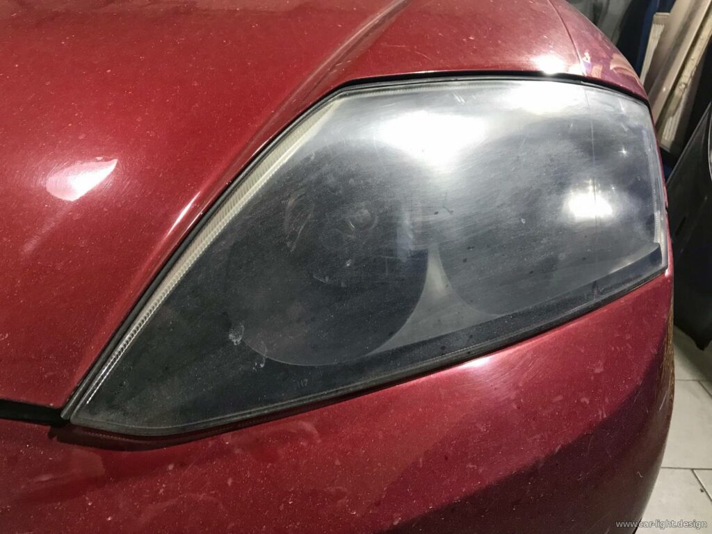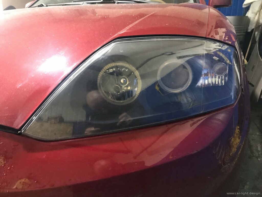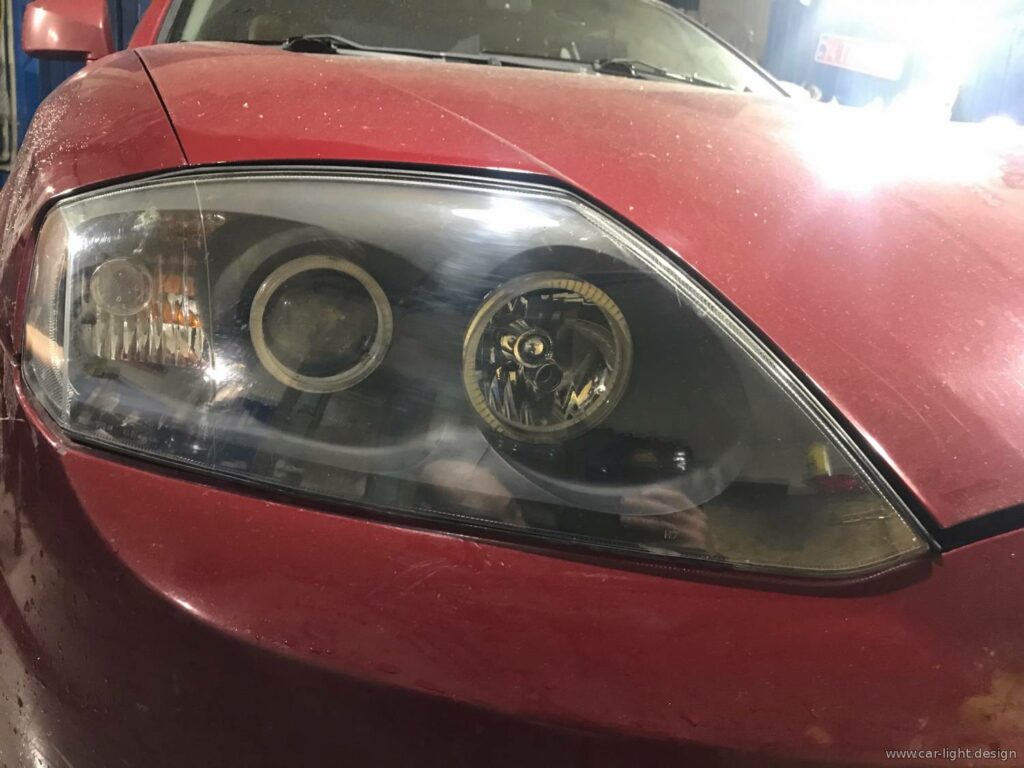 Перш ніж монтувати янгольські оченята, потрібно було привести фари до ладу. Усередині накопичився пил і бруд, а скло втратило прозорість. Без профілактики нові елементи не виглядали б гармонійно. Спеціалісти розібрали фари, почистили внутрішні елементи, а потім герметично запакували їх, витримавши технологічну паузу для кристалізації шва. Далі фари повернули на авто для полірування.