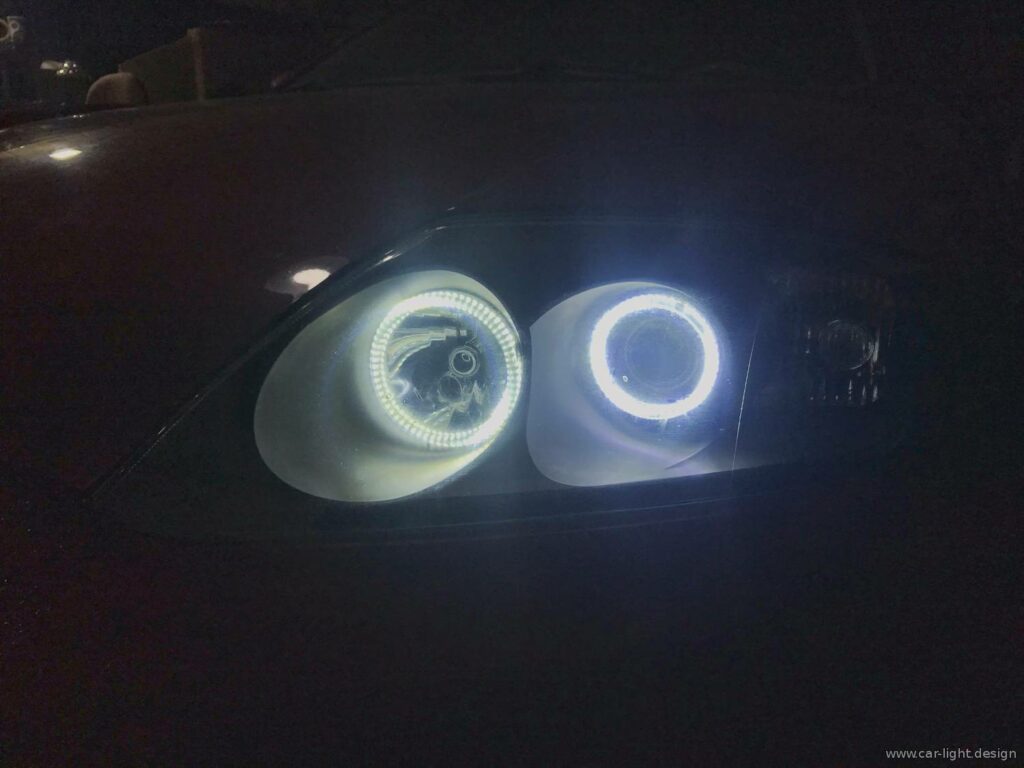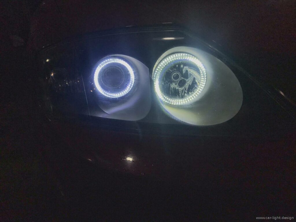 Після комутації проводки янгольські оченята ожили — тепер вони працюють у режимі габаритних вогнів. Це надало автомобілю не лише сучасного вигляду, а й додало індивідуальності.
