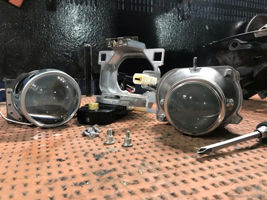 Фари зняли з автомобіля, розібрали й встановили нові бі-ксенонові лінзи 3.0 дюйма. Також виконали полірування скла для відновлення прозорості.